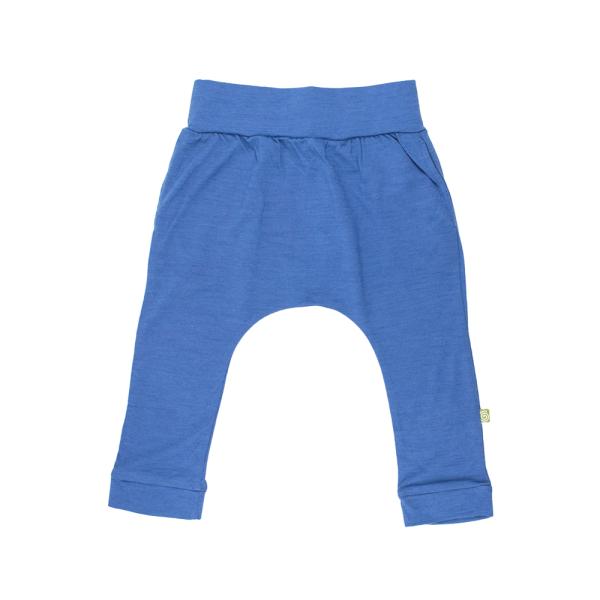 Bløde ballonbukser i klar blå fra Nui Organics, syet i økologisk merinould jersey. Bukserne er konstrueret med kun sidesømme, så der ikke er sømme foran og bagpå, hvilket giver ekstra komfort og en rund pasform med god plads til ble.